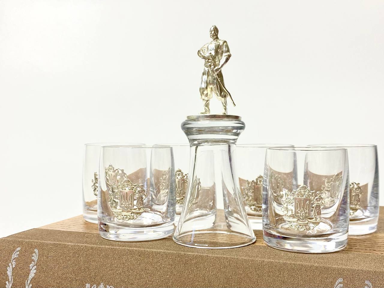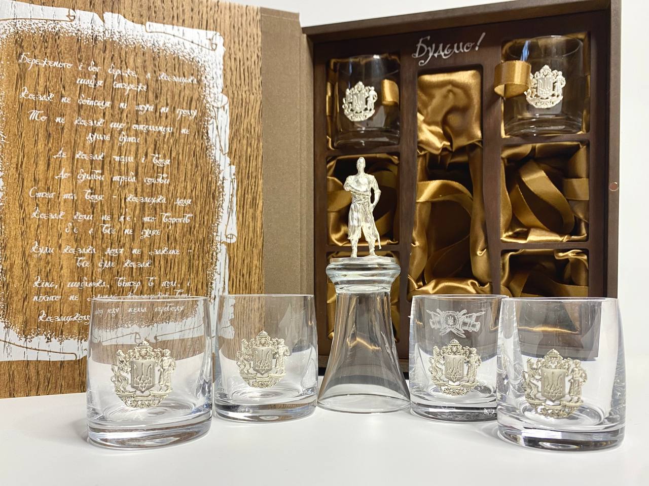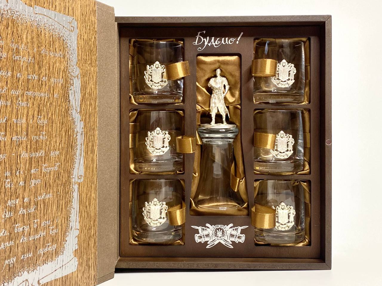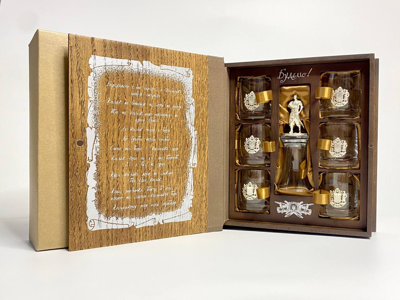 Подарункове видання Книги-Бару «Козацькому роду нема переводу» - розкішний символічний подарунок для гостинного українця. Всередині розміщений набір із 6 чарок 50мл (BOHEMIA) з гладкою поверхнею, які видають прозорий звук при дотику та ідеально виблискують на світлі. Склянки декоровані об'ємними накладками із зображенням Великого