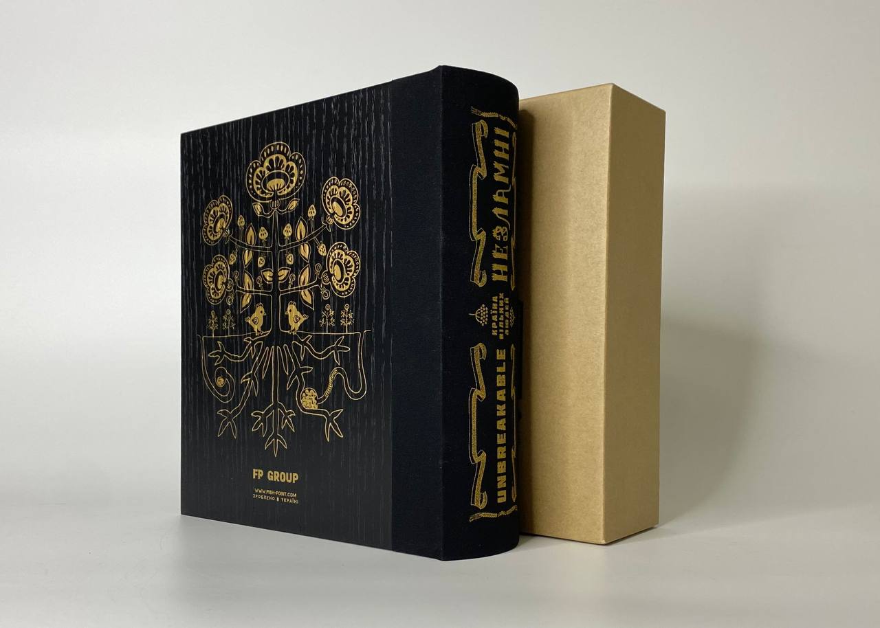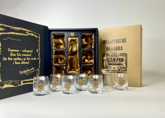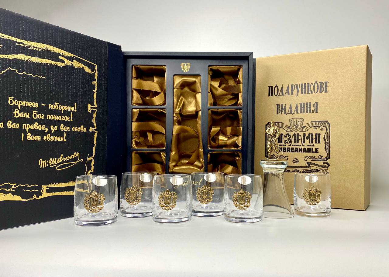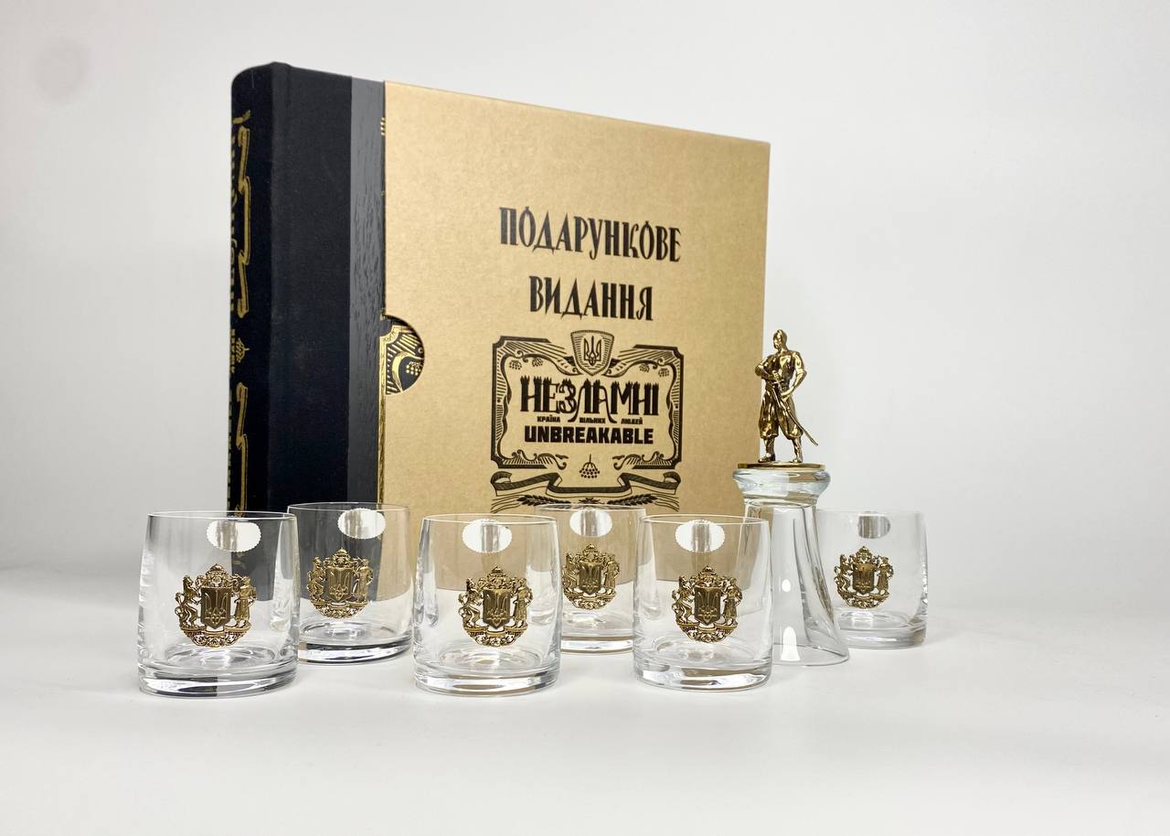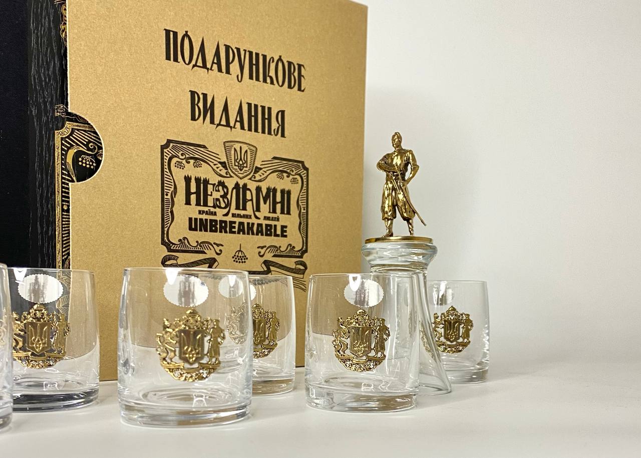 Бар-книгу виготовлено з дубу, оздоблено автентичними ілюстраціями в кольорі золота, що символізує багатство, справедливість, могутність, повагу. "Незламні" склянки декоровані накладками з бронзи із зображенням Великого державного гербу України, щоб кожен ковток був наповнений патріотичною гордістю.