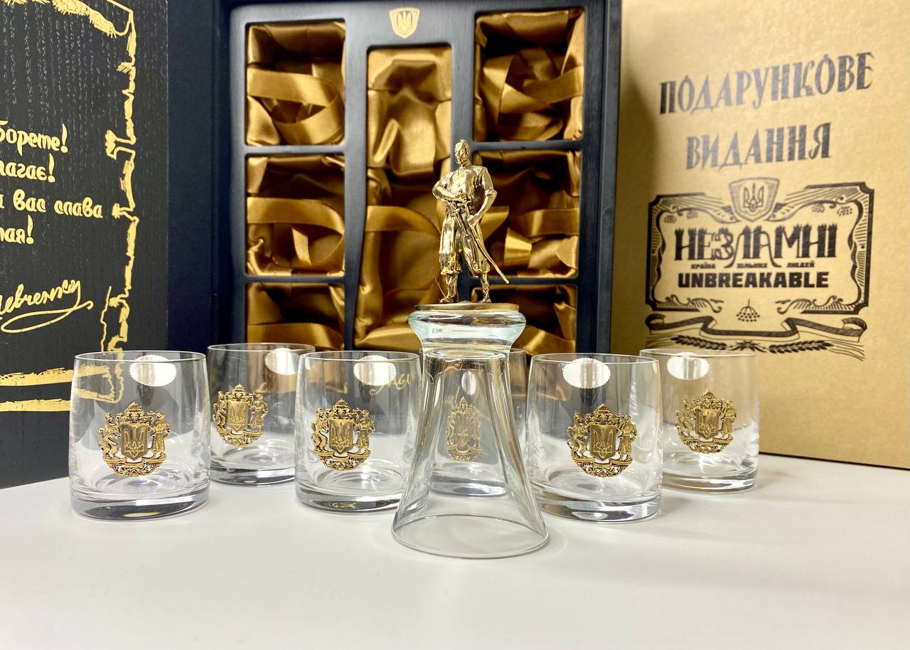 Бар укомплектований 6 чарками 60мл BOHEMIA + штрафна чарка зі статуеткою козака. «Штрафну» неможливо поставити , за наших героїв – лише ДО ДНА!