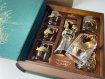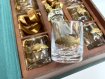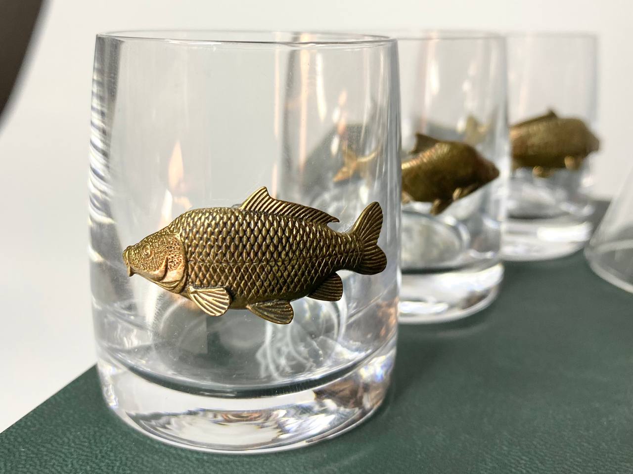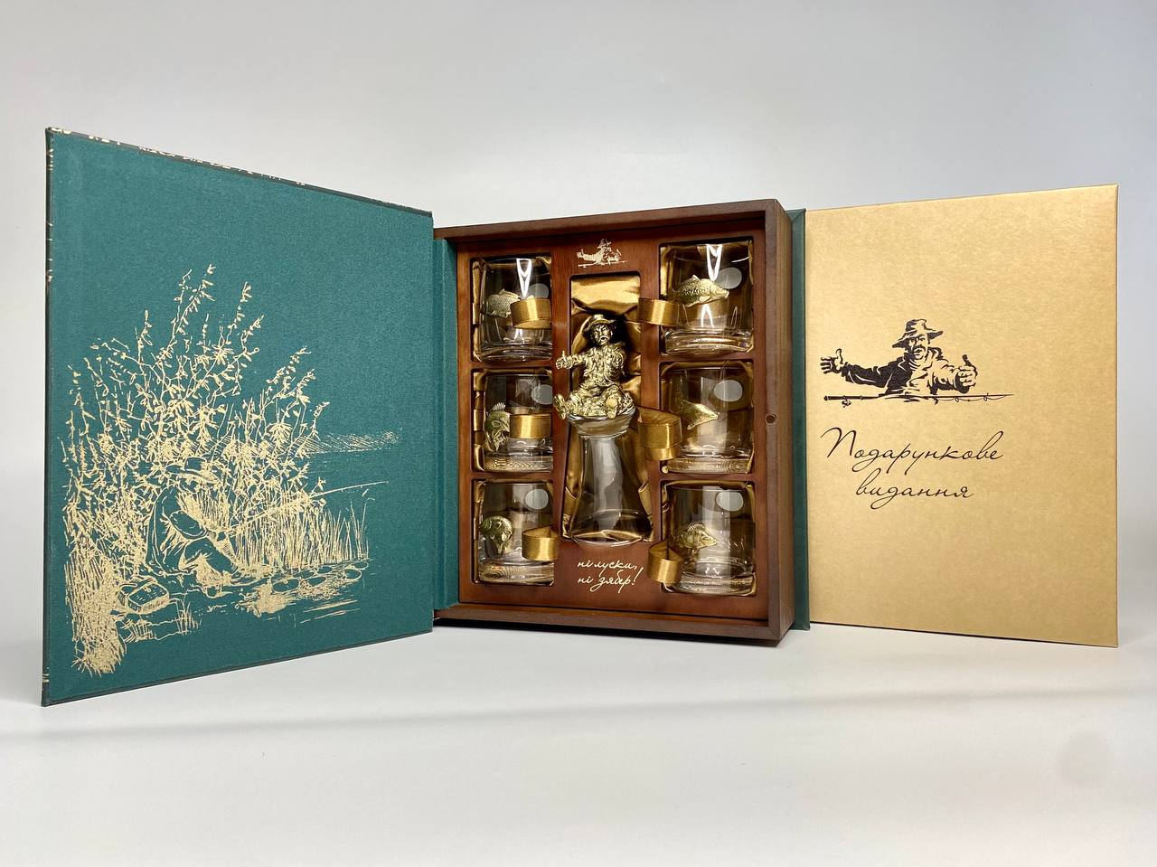 Набір складається з 6 чарок 50мл Bohemia та ексклюзивної «штрафної» чарки зі статуеткою риболова, що натхненно розповідає про свої трофеї. Родзинка штрафної в тому, що при наповнені її неможливо поставити. Лише до дна! Кожна чарка декорована різним художнім елементом з бронзи у вигляді найпопулярніших риб українських водойм: короп, лящ, окунь, судак, щука, короп дзеркальний.