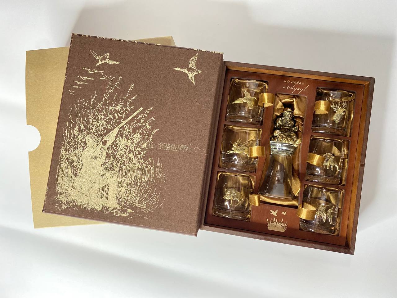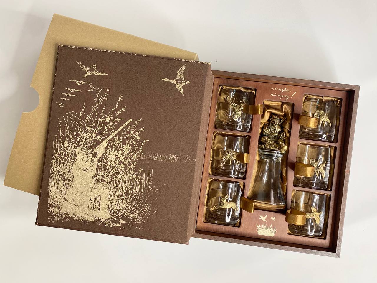 Цей набір стане ідеальним подарунком для мисливця, який цінує не тільки захоплення полюванням, але й гарні, цінні речі, що нагадують про його улюблене хобі. Набір можна одночасно використовувати як за прямим призначенням в близькому колі однодумців, так і для прикрашання інтер'єру мисливського будинку або кабінету.