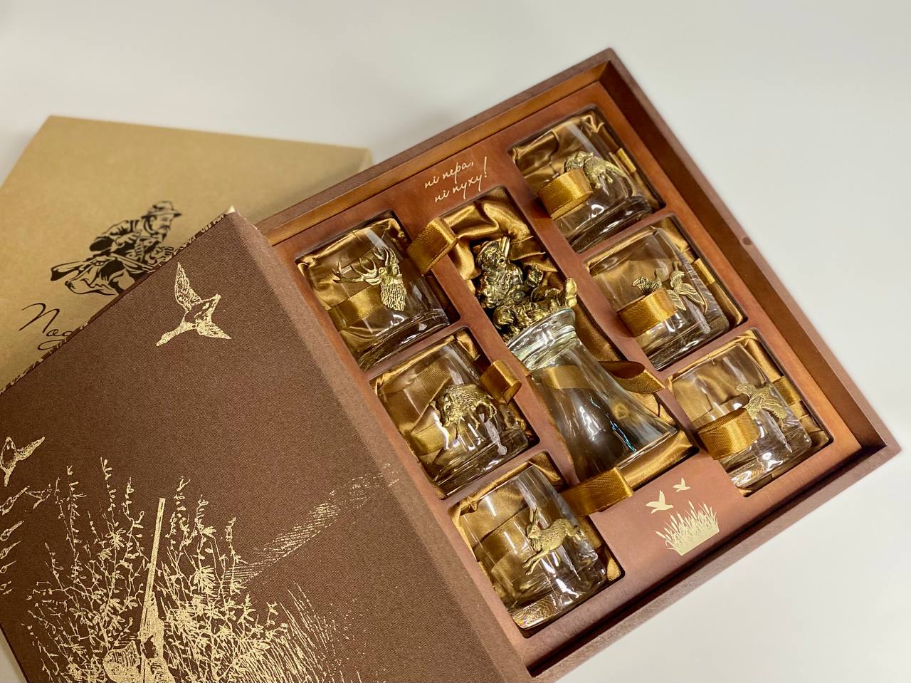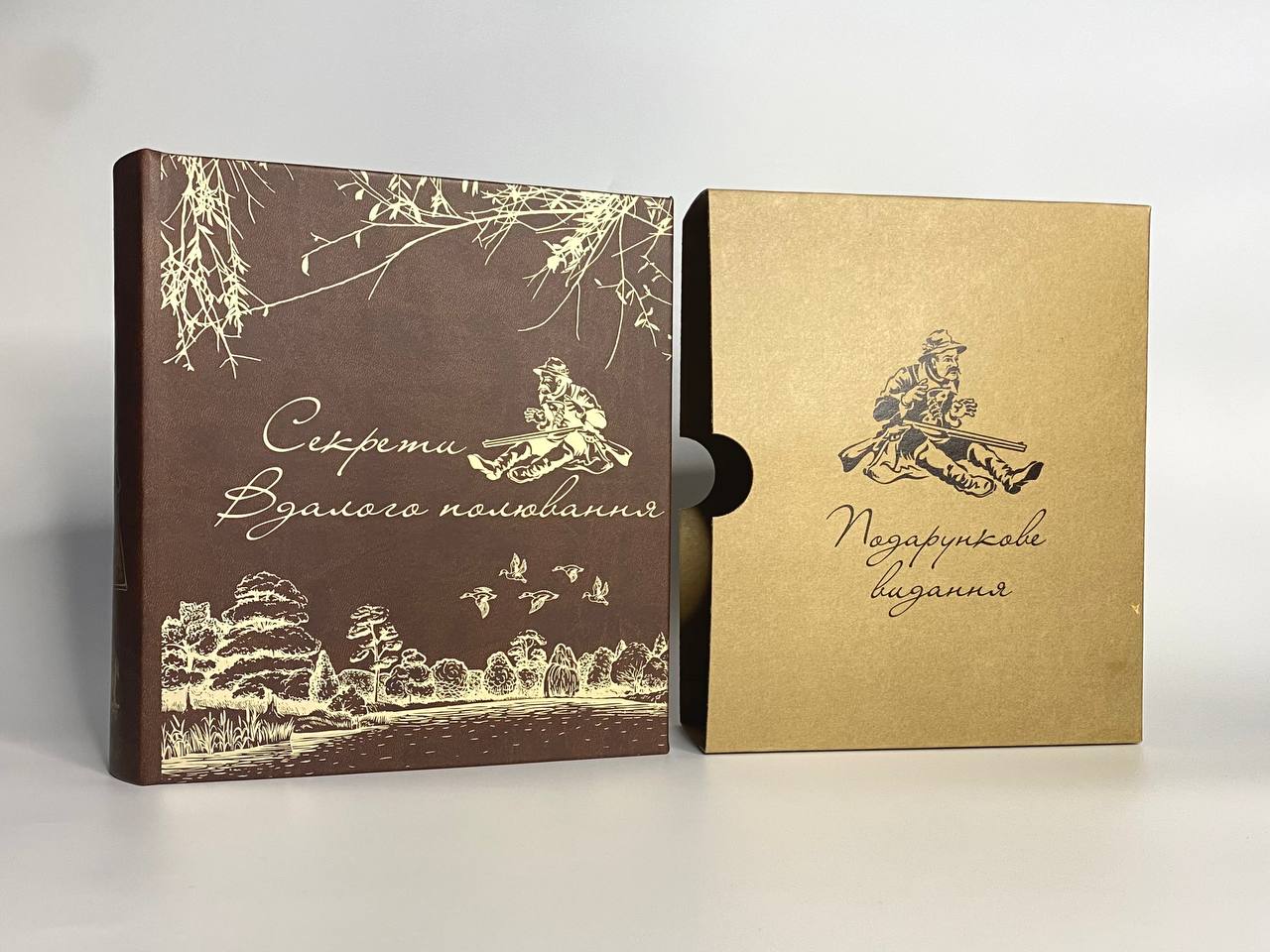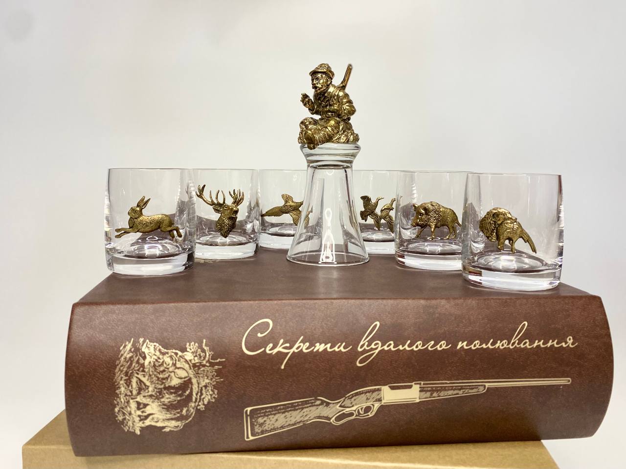 Нове подарункове видання "Секрети вдалого полювання" є елегантним і стильним подарунком для поціновувачів мисливської тематики. Набір складається з 6 чарок 50мл Bohemia та ексклюзивної «штрафної» чарки зі статуеткою мисливця, що натхненно розповідає про свої пригоди на полюванні. Родзинка штрафної в тому, що при наповнені її неможливо поставити. Лише до дна! Кожна чарка декорована різним художнім елементом з бронзи у вигляді бажаних мисливських трофеїв: олень, заєць, кабан, фазан, качки, спанієль з фазаном. Обкладинка книги виконана з екошкіри та прикрашена мисливськими мотивами.