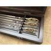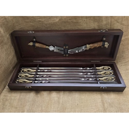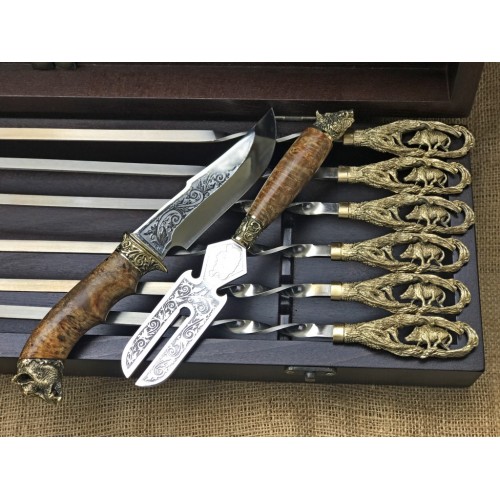 1. 6 шампурів у вигляді "Кабана". Тверда харчова нержавіюча сталь товщиною 3мм. Довжина шампура: загальна - 69 см; робоча - 50 см Ручка: ювелірне художнє лиття з бронзи (при використанні ручка не нагрівається)