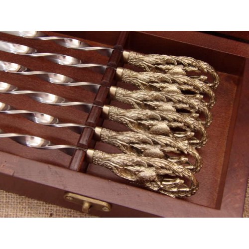 Набір складається з 6 шампурів у вигляді "Сокола який вполював зайця", які упаковуються у дерев'яний кейс.