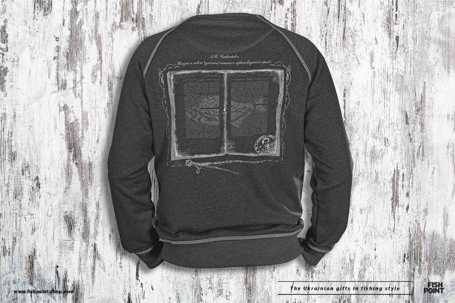 На спині світшота зібрані найцікавіші розповіді про сома з оригінальної книги Леоніда Павловича Сабанєєва.
