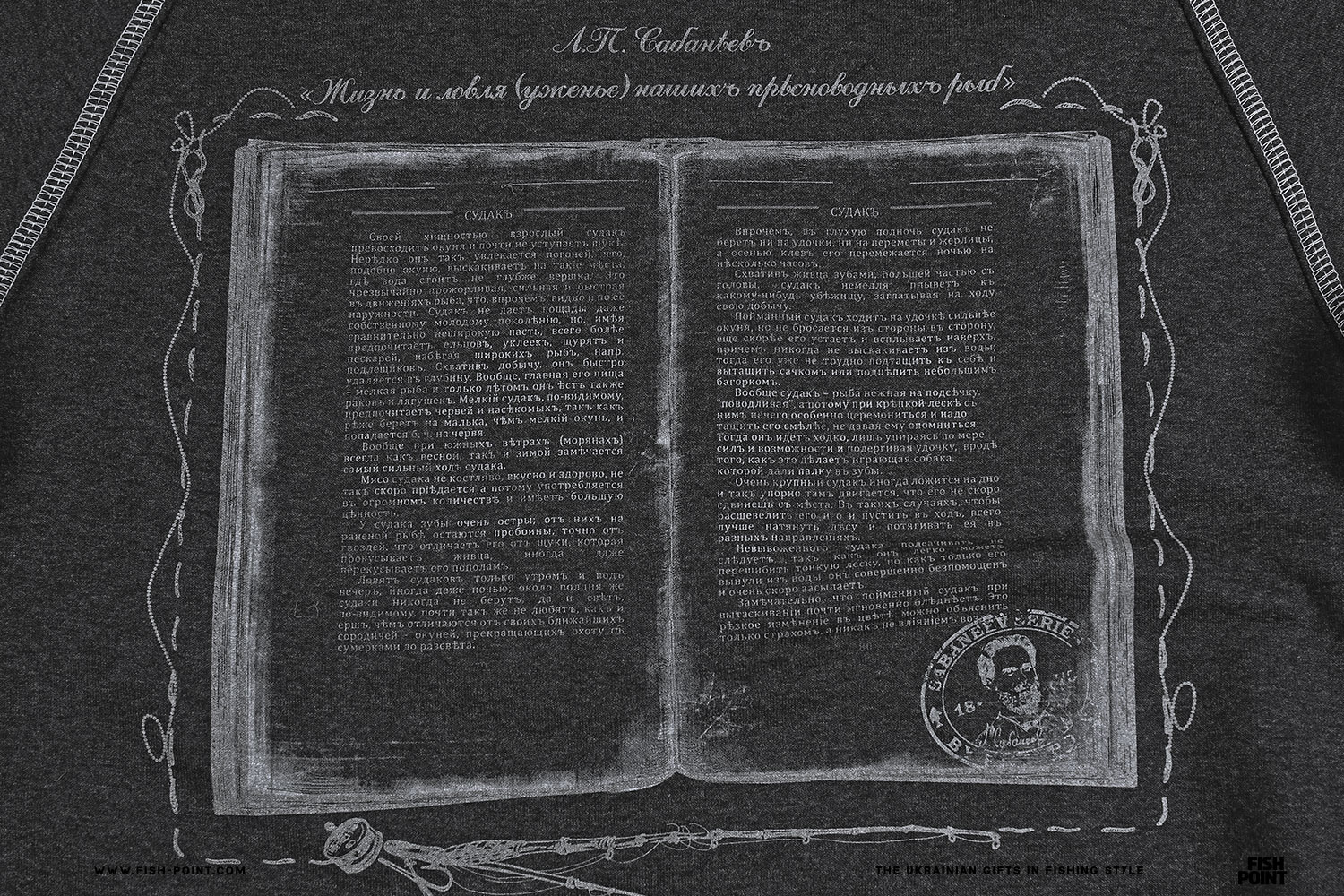 На спині світшота зібрані найцікавіші розповіді про судака з оригінальної книги Леоніда Павловича Сабанєєва.