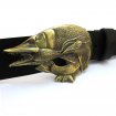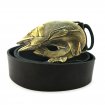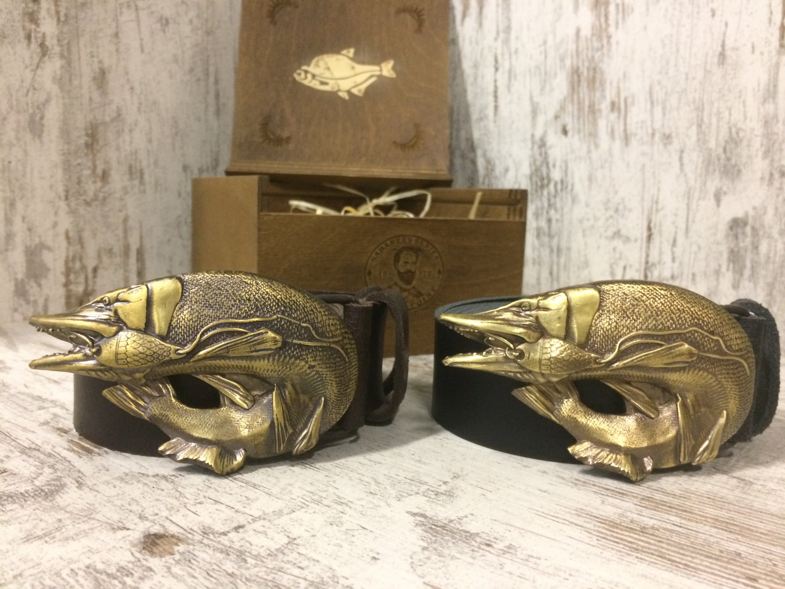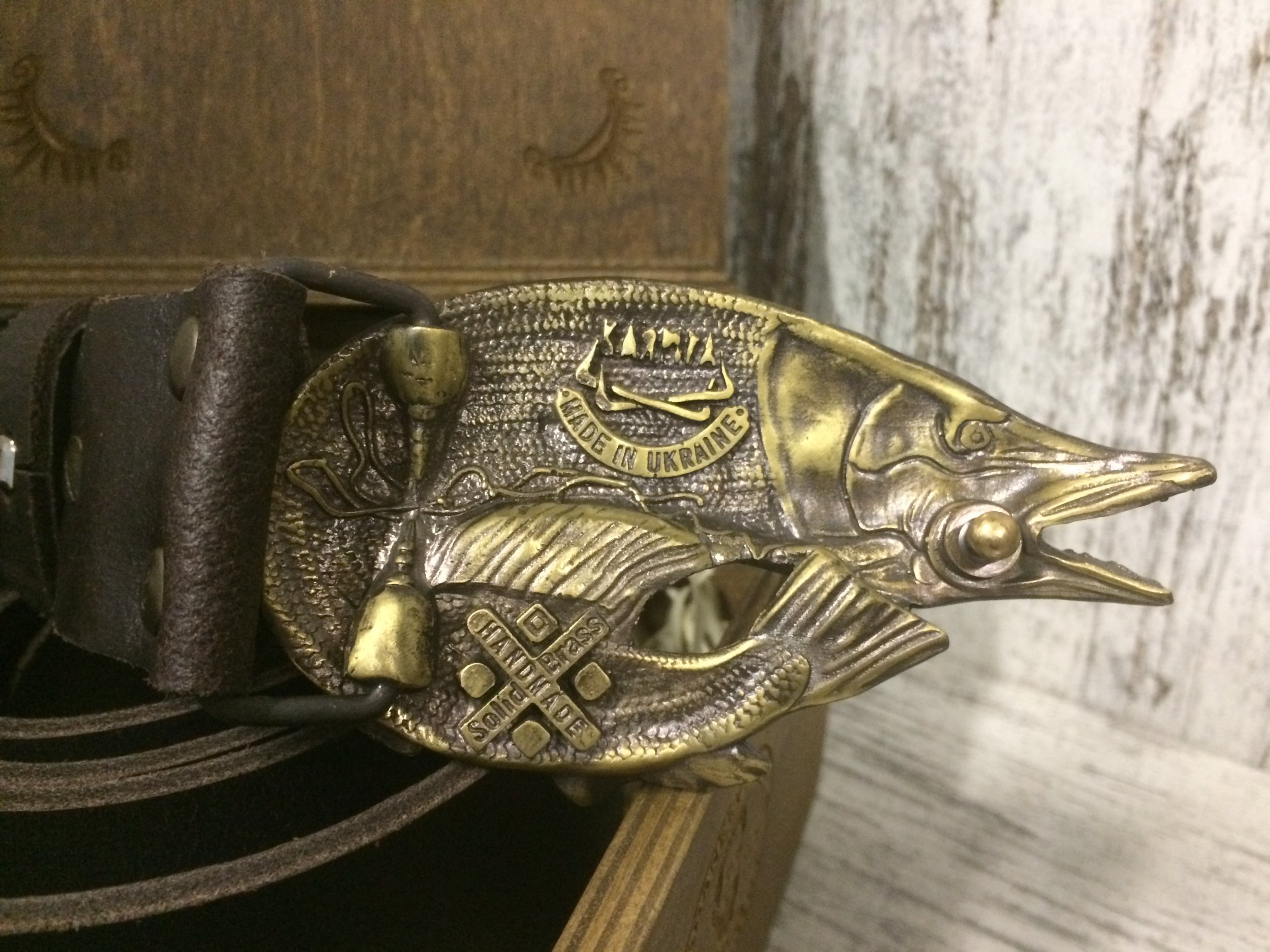 Пряжка відлита з латуні. Після відливу кожну пряжку майстер доводить вручну, тому кожен виріб - індивідуальний. Для пасків використовуємо телячу шкіру, вирізаємо суцільним шматком. Шкіра пасків спеціальна, ремінна, українського виробництва. На Ваш вибір два кольори - коричневий та чорний.