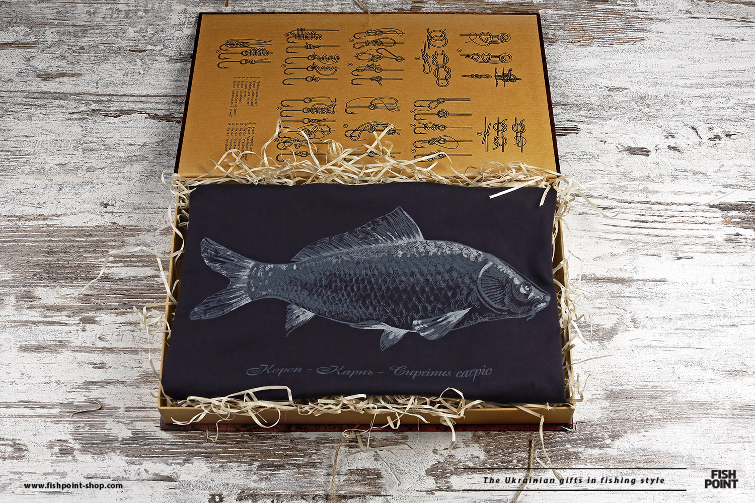 Футболка упаковывается в эксклюзивный тубус, или подарочную коробку, сделанную в виде книги Леонида Павловича Сабанеева «Жизнь и ловля наших пресноводных рыб». Внутри Вы найдете схемы рыболовных узлов, а коробка будет служить местом хранения мелких рыбацких принадлежностей.