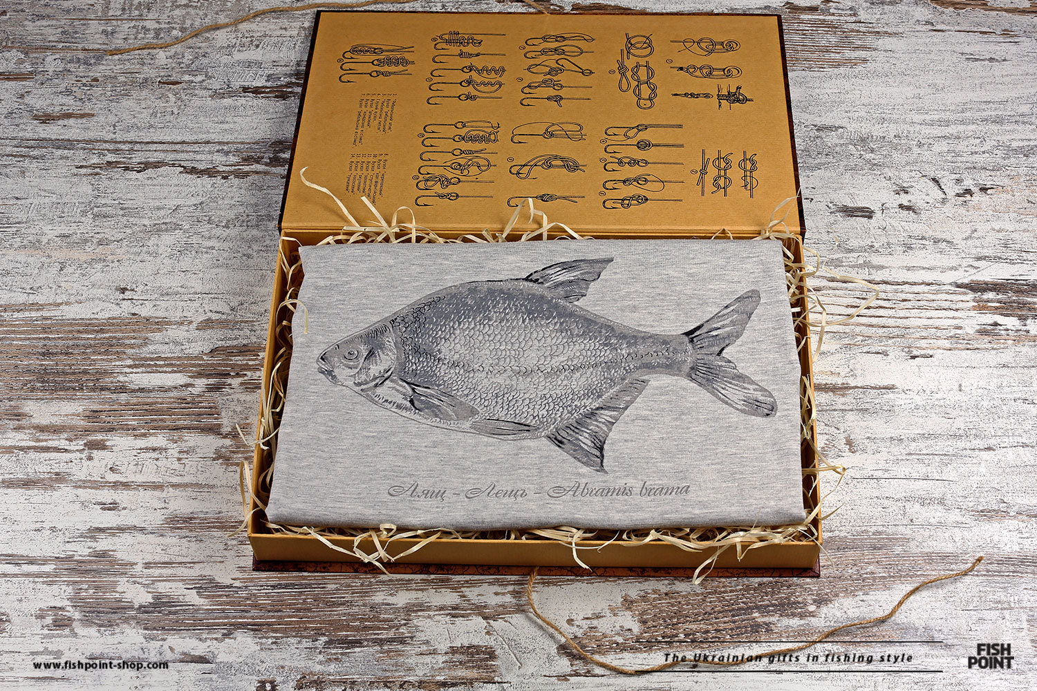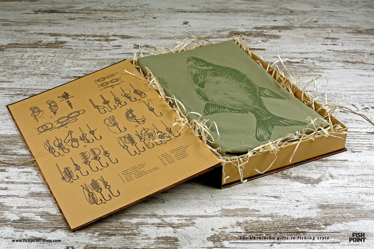 Футболка упаковывается в эксклюзивный тубус, или подарочную коробку, сделанную в виде книги Леонида Павловича Сабанеева «Жизнь и ловля наших пресноводных рыб». Внутри Вы найдете схемы рыболовных узлов, а коробка будет служить местом хранения мелких рыбацких принадлежностей.