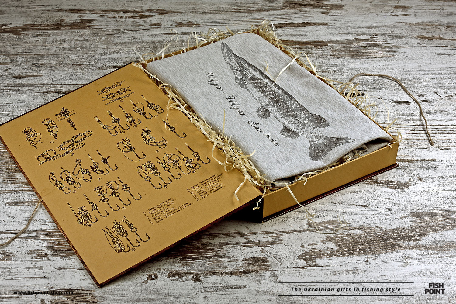 Футболка упаковывается в эксклюзивный тубус, или подарочную коробку, сделанную в виде книги Леонида Павловича Сабанеева «Жизнь и ловля наших пресноводных рыб». Внутри Вы найдете схемы рыболовных узлов, а коробка будет служить местом хранения мелких рыбацких принадлежностей.
