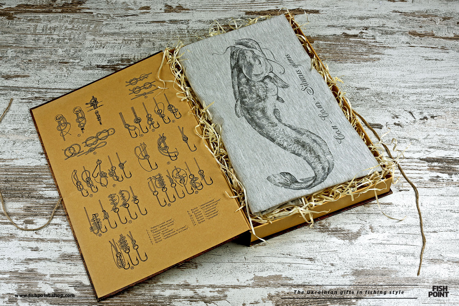 Футболка упаковывается в эксклюзивный тубус, или подарочную коробку, сделанную в виде книги Леонида Павловича Сабанеева «Жизнь и ловля наших пресноводных рыб». Внутри Вы найдете схемы рыболовных узлов, а коробка будет служить местом хранения мелких рыбацких принадлежностей.